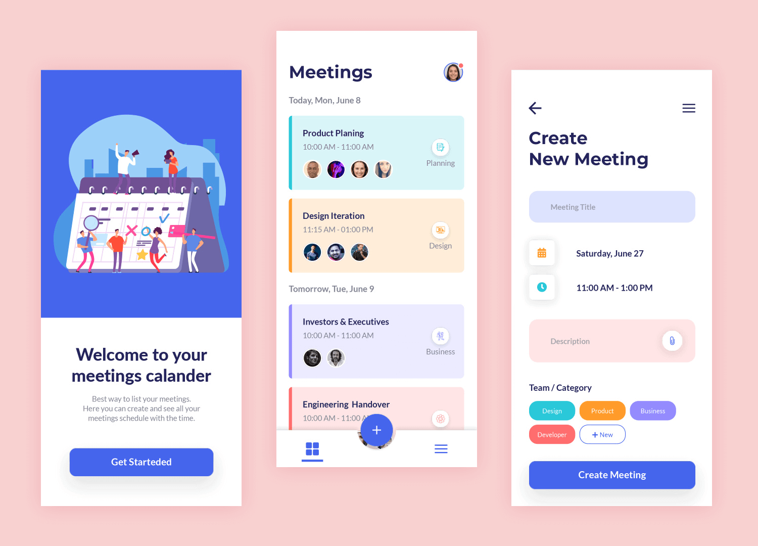 Let’s talk about a design that feels as welcoming as it is practical. This Meeting Scheduler App uses vibrant colors and a clean layout to make organizing meetings less of a chore. From the friendly “Welcome” screen to the categorized meeting cards, everything is designed to keep you focused without being overwhelming.