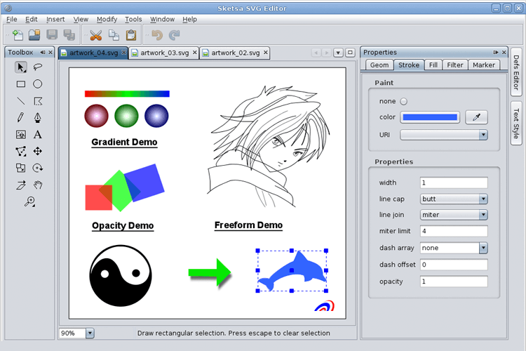 Sketsa SVG Editor is a free cross-platform SVG drawing application. It includes multiple tools for content creation, allowing you to easily draw, manipulate and edit objects. It also includes a source editor with syntax highlighting. This lets you view and edit the underlying SVG XML source code for maximum control.