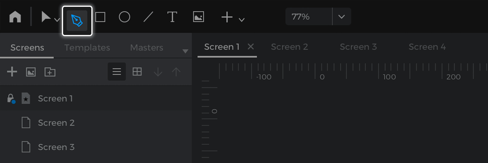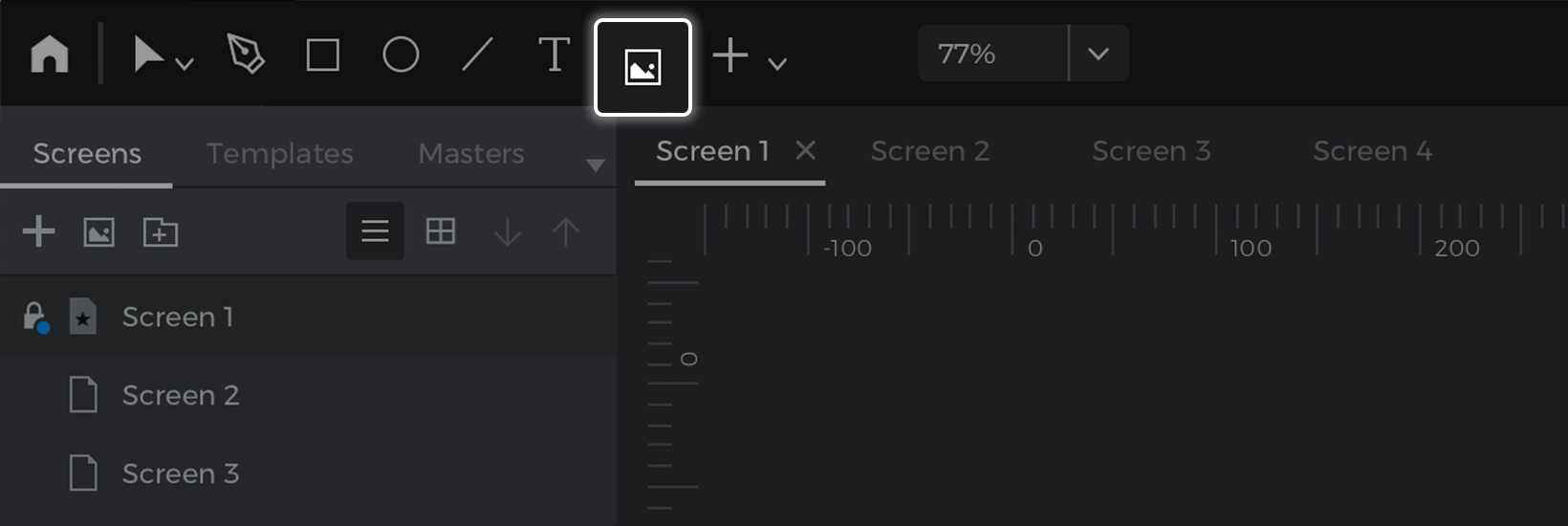 2. Screens – view and add new screens in the Screens palette. Screens are similar to Artboards or Frames in other applications. Each screen contains its own Canvas and an entire project can contain many different screens, which you can link together using events.Click the ‘+’ button in this palette to add a new screen.