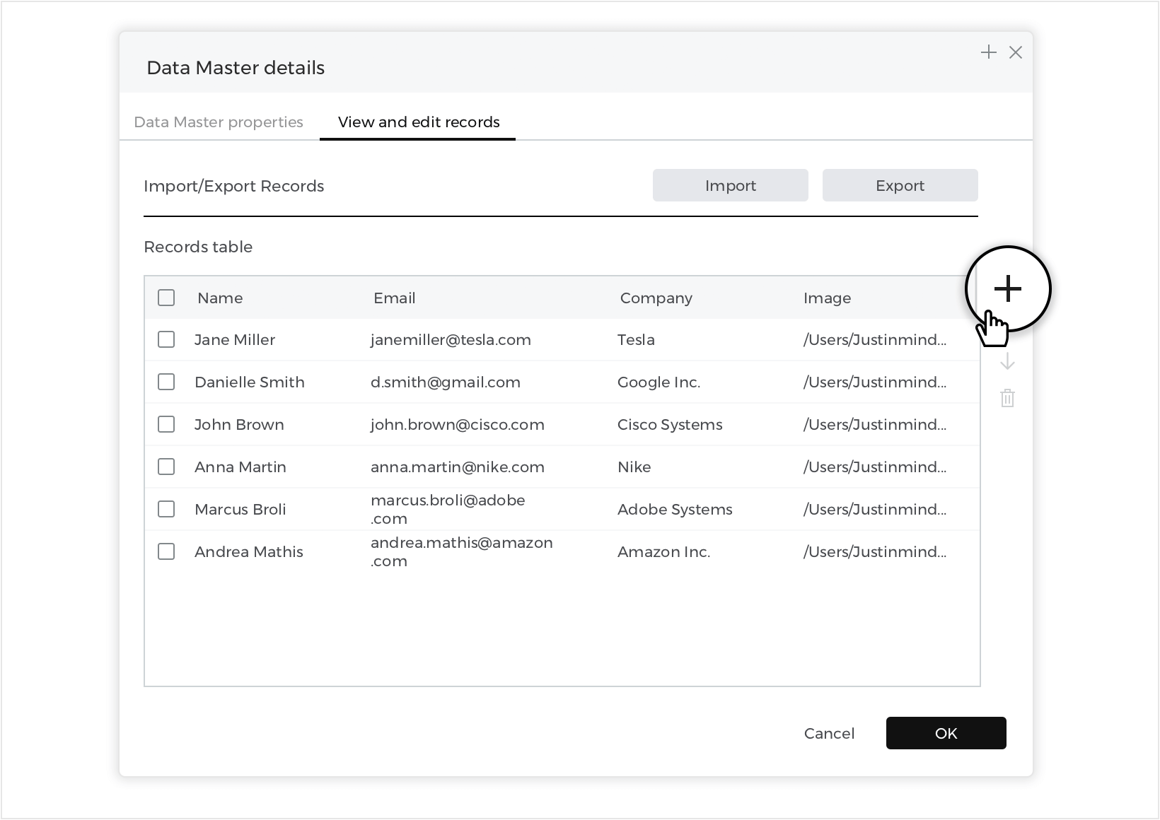 - Back in the Data Masters palette, right click on your Data Master and select the View and Edit records tab in the dialog that appears. Create data Records, giving each a name, email, company and image. Click “OK”.