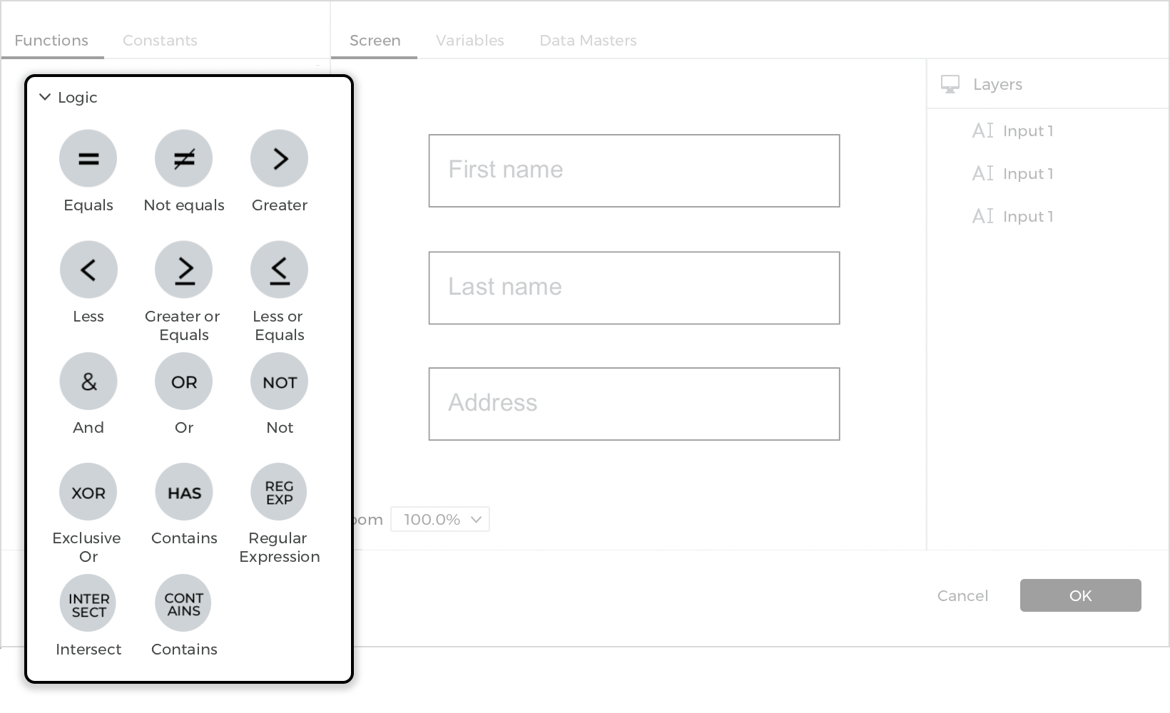 The Expression Builder dialog can be used to create conditional logic, calculated values, error messages or for simulating a database. This dialog opens up either when you want to add a condition to an event or when you want to create a set value action with a calculated value.