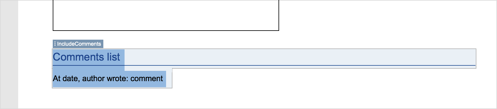 - You can add a condition, which will ensure the comment element is not printed if there are not comments present. To do so, add a “Rich text” control to all the elements that you don’t want to print unless they include. Use the “IncludeComments” tag.