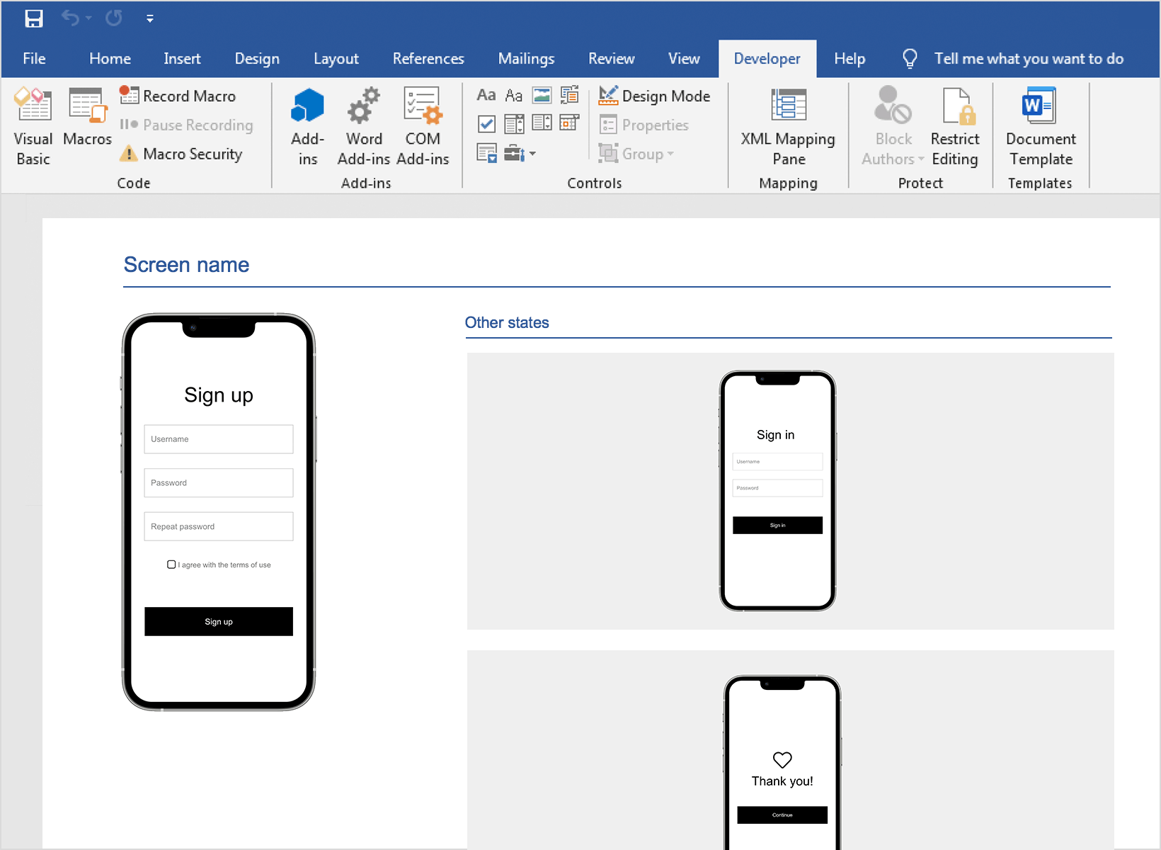 - Open a new document in Microsoft Word and add a large image representing the prototype’s current screen and another to represent its other states (e.g. when additional panels from within a Dynamic Panel are active). Your document template should look something like this: