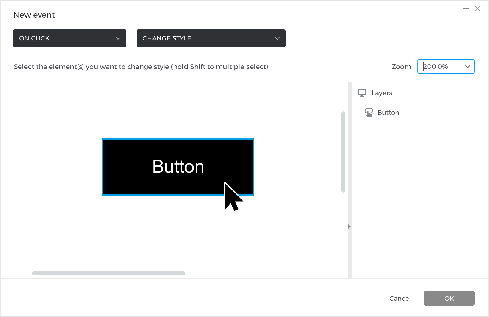 Note: on mobile and tablet prototypes, On Click will be On Tap. - You’ll see the ‘Action’ dropdown appear next. Click on it and pick a resulting action. As an example, you can choose Change Style.