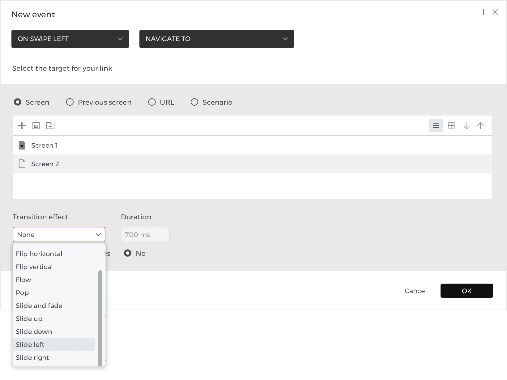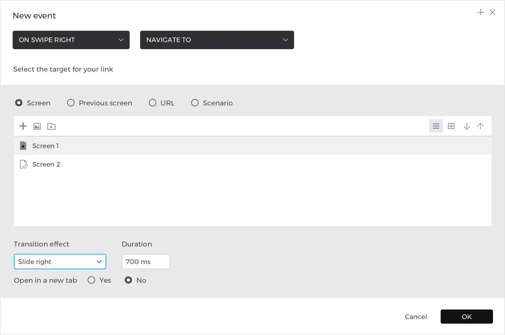 - Pick an On Swipe Right trigger and a Navigate To action, and choose Screen 1 to link to. Add a ‘Slide right’ transition effect, and click ‘OK’ to finish building the event.