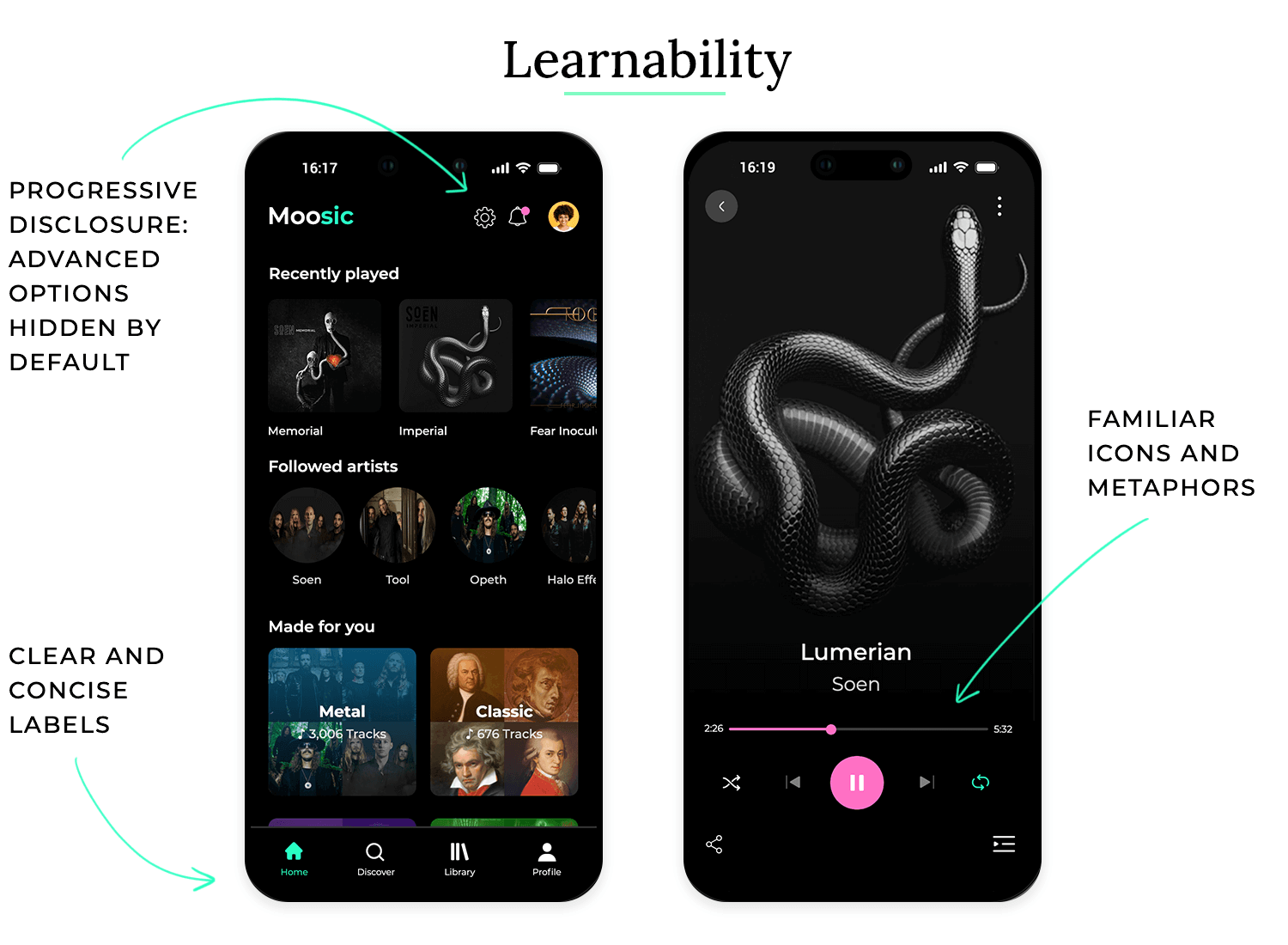 Learnability in UI design ensures that users can quickly and easily learn how to use an interface because it leverages familiar patterns, provides clear guidance, and minimizes the cognitive effort required to understand its functionality. Take this music streaming app as an example.