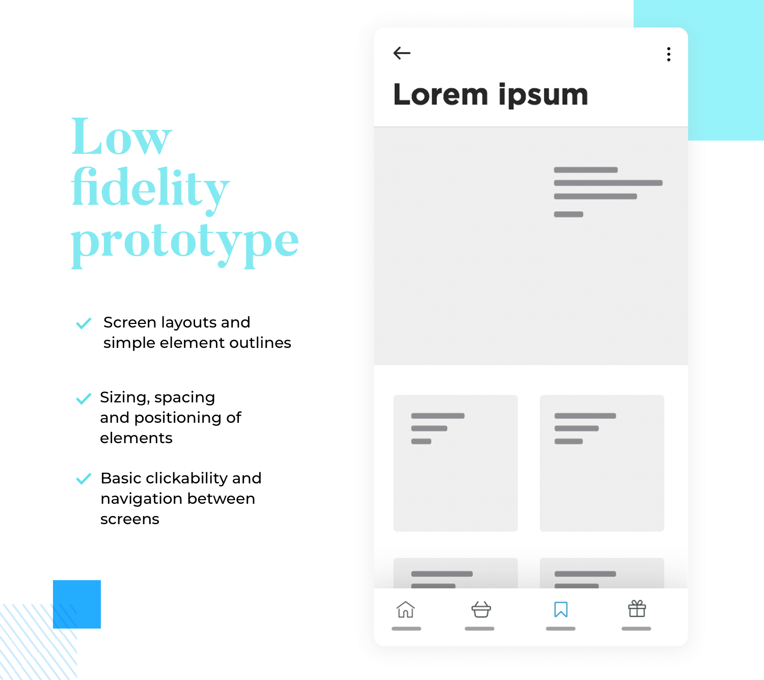 The reason for simplicity at this stage is to solely keep the focus of attention on fundamental screen layouts, information architecture (IA) and navigation. This helps to conceptualize the product’s basic functionality without extraneous distractions. It’s also useful for early user testing and obtaining crucial stakeholder buy-in, before any advanced interaction and UI design is added.