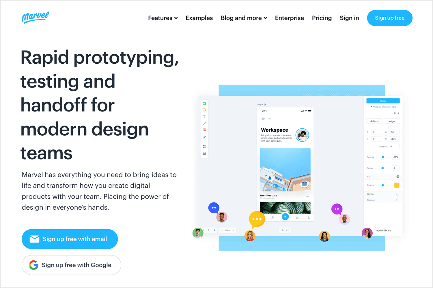 Marvel offers a free plan with limited features, while premium plans for advanced tools start at $12/user/month.