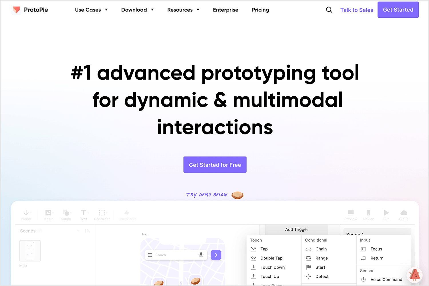 ProtoPie focuses on high-fidelity prototyping with advanced interactions. It’s a standout Sketch alternative for creating prototypes with logic and conditions, offering designers full control over how elements behave.